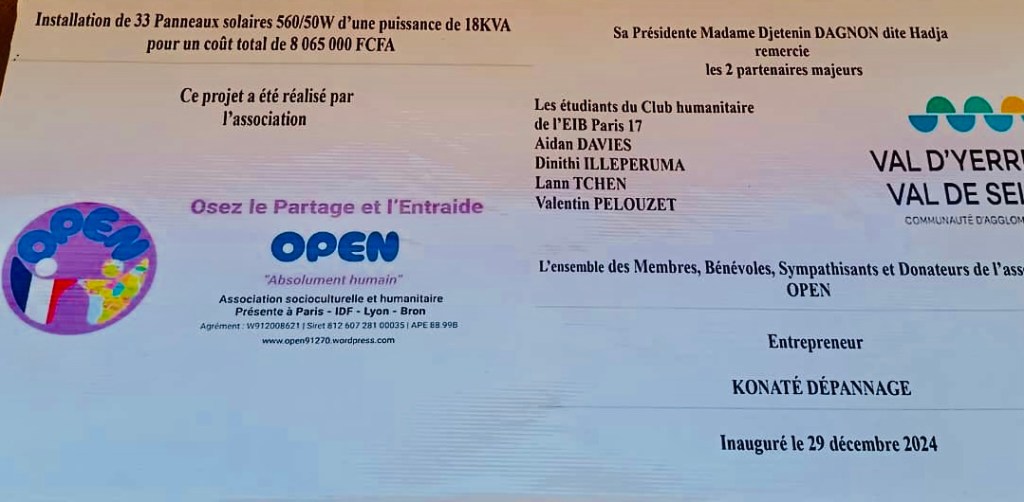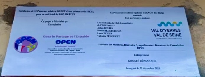 Dimanche 29/12/24, diverses personnalitĂ©s du quartier de Sabalibougou et de la Commune V du district de Bamako Mali, Ă©taient prĂ©sentes Ă la cĂ©rĂ©monie dâinauguration du Kit solaire dâune capacitĂ© de 18KVA installĂ© par notre association au centre de santĂ© communautaire CSCOM-I. Le projet I2P portĂ© par notre structure avec comme objectif de permettre au centre de santĂ© dâallĂ©ger ses factures dâĂ©lectricitĂ© et de mieux accompagner les malades dĂ©munis a coĂ»tĂ© 8 065 000 FCFA soit 12 355âŹ. Avec la rĂ©alisation de ce magnifique projet Ă vocation Ă©cologique, Ă©conomique et humaine, OPEN se positionne ainsi dans le rang des acteurs de la solidaritĂ© internationale. Un grand merci Ă lâensemble des membres, bĂ©nĂ©voles, sympathisants et donateurs.