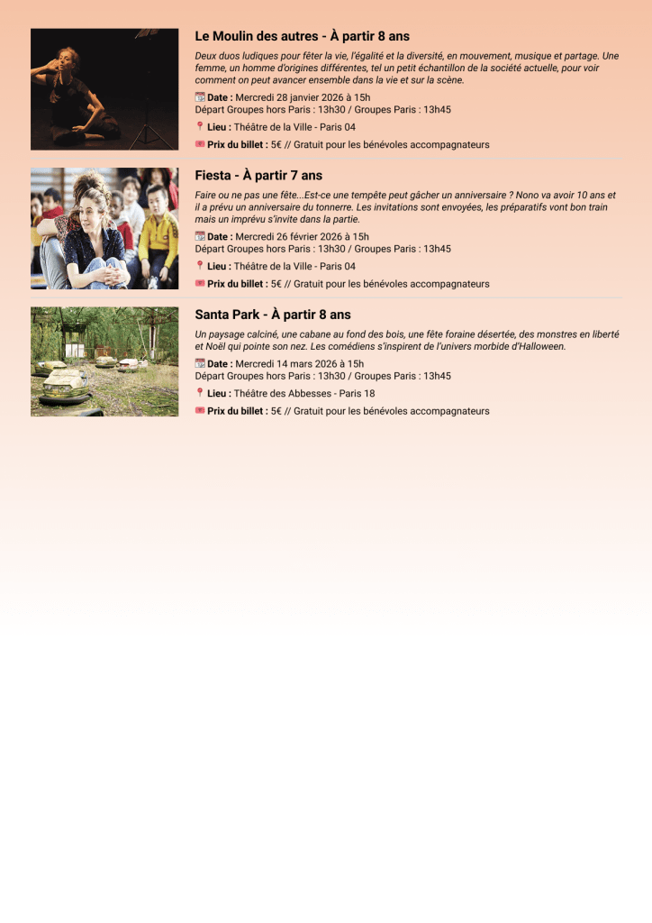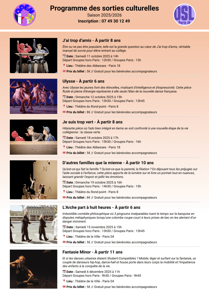 Depuis quelques années maintenant, l’association organise des sorties culturelles et loisirs avec des enfants issus de milieux modestes. Au programme : sorties au théâtre, au musée, dans des centres de loisirs, à la piscine, à la Foire du Trône, etc.